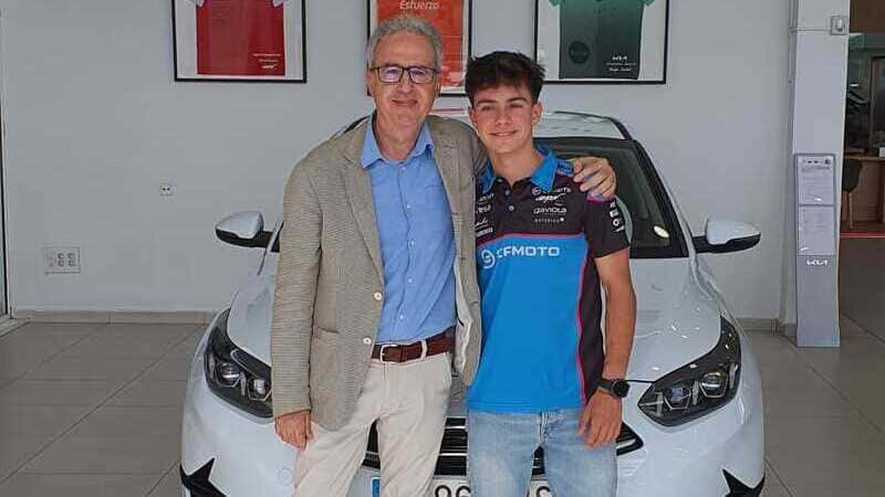 Valencia, 8 de agosto de 2024. Kia Autopista Sur ha entregado recientemente un vehículo de su gama al David Alonso, piloto del Aspar Team y actual líder del campeonato del mundo de Moto3. Se trata de una unidad de la serie Kia Ceed en su acabado Tech, con la que el joven deportista del equipo dirigido por Jorge Martínez Aspar ya ha comenzado a utilizar para sus desplazamientos diarios.